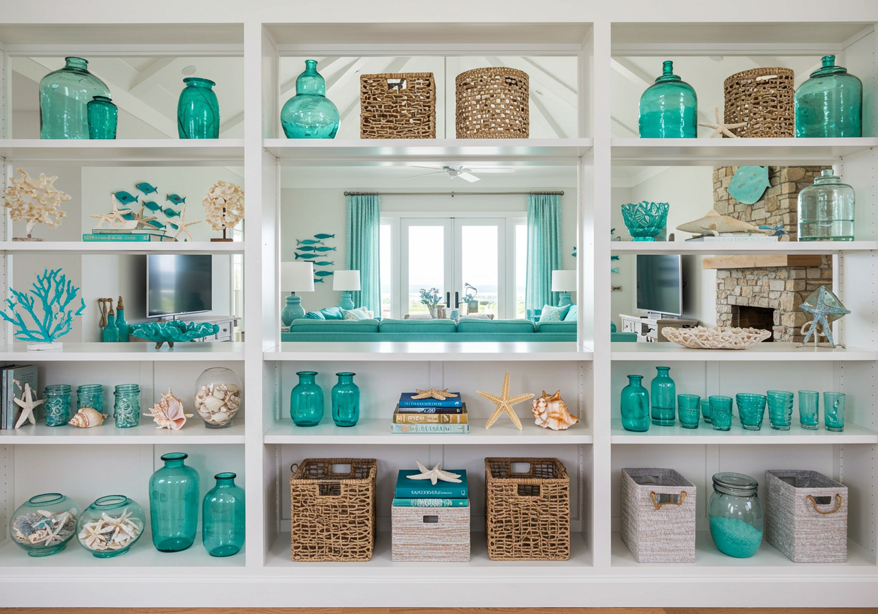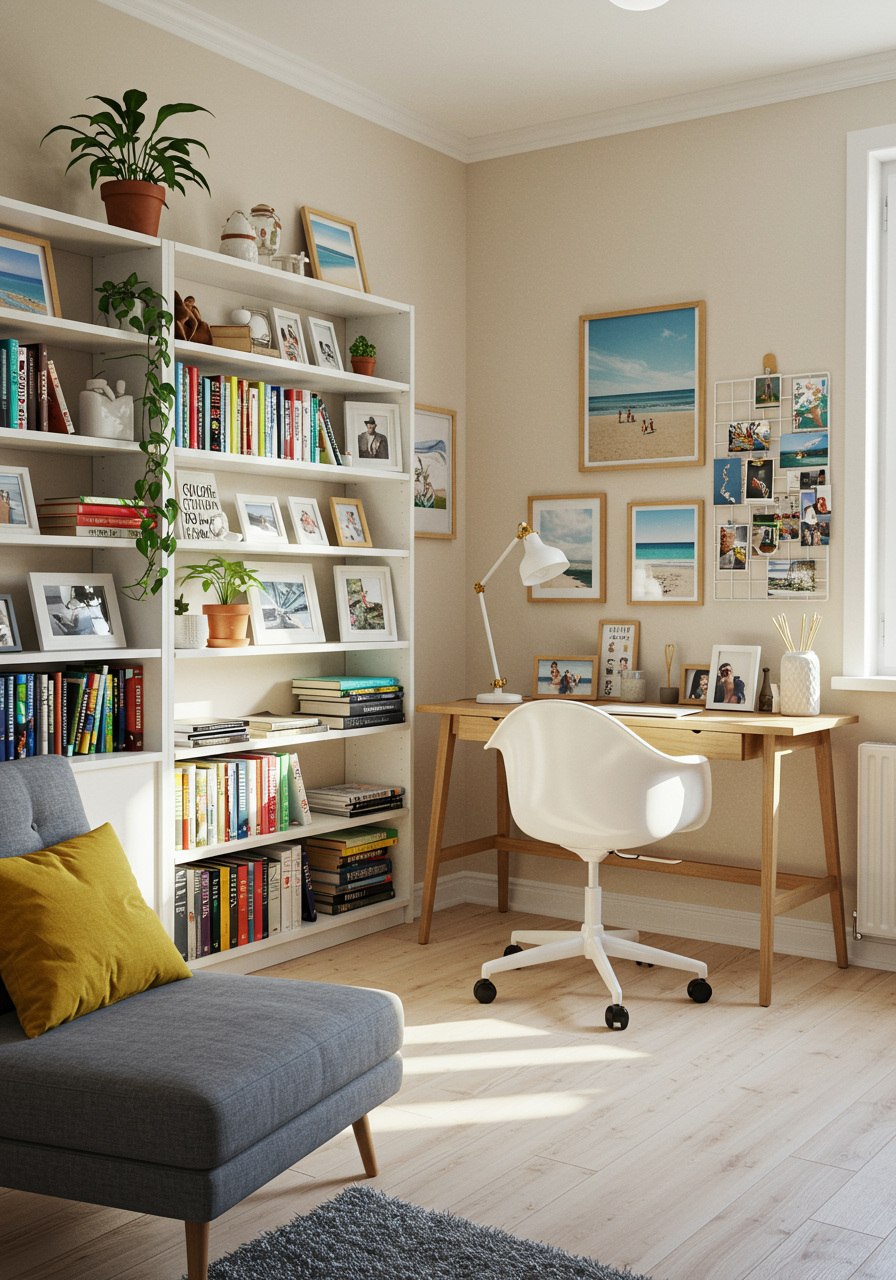 “Take a simple white bookcase that you might already own and make it into a masterpiece filled with colorful books, decorative art pieces collected from travel, plants, framed postcards, and more.”